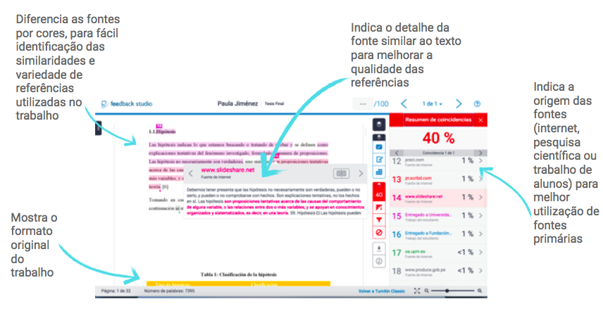 O diferencial TurnitinO relatório gerado nas ferramentas da Turnitin é o único que mostra a comparação não somente com conteúdo disponível na internet, como também trabalhos de estudantes de todo o mundo e publicações científicas de repositórios fechados de parceiros exclusivos como Scielo, Crossref, Springer, Elsevier, entre muitos outros.