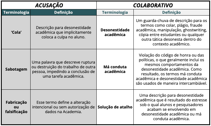 Reformulando a Integridade Acadêmica e a má conduta para centralizar a jornada de aprendizagem.De acordo com artigo no Journal of Academic Ethics, “uma compreensão consistente e o uso de termos acordados em conjunto permitem a perspectiva de um grupo de valores compartilhados''. Isso também garante a possibilidade de desenvolver soluções comuns internacionalmente aceitáveis, relacionadas aos métodos de ensino, ao conteúdo e às estratégias preventivas para a má conduta acadêmica. Chegar a um consenso sobre esses conceitos fundamentais, por sua vez, levaria a alianças entre vários campos da ciência. No entanto, para conseguir isso, as variações na conceituação e uso de termos-chave precisam ser discutidas e acordadas” (Tauginiené, et al. 2019).
